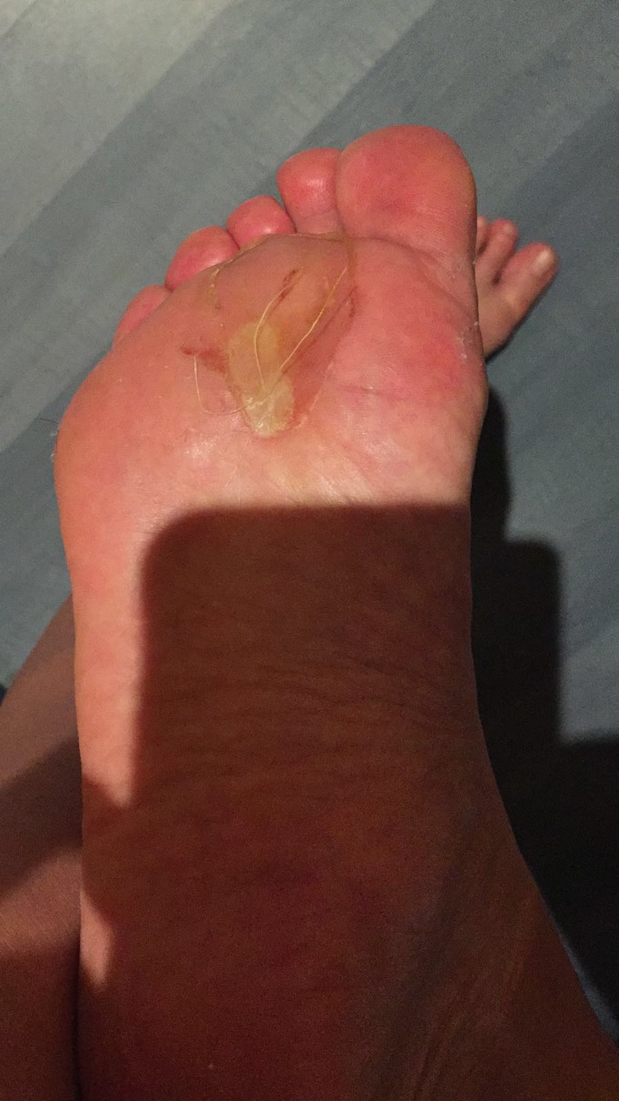 Al llegar a Sto Domingo hicimos picnic a la ves que descansábamos y me checaba el pie…al quitarme el calcetín ya tenia ampolla xq olvide embetunarme con vaselina los pies esa mañana ?. Rubia tmb ?….pies de princesas las dos ja ja.