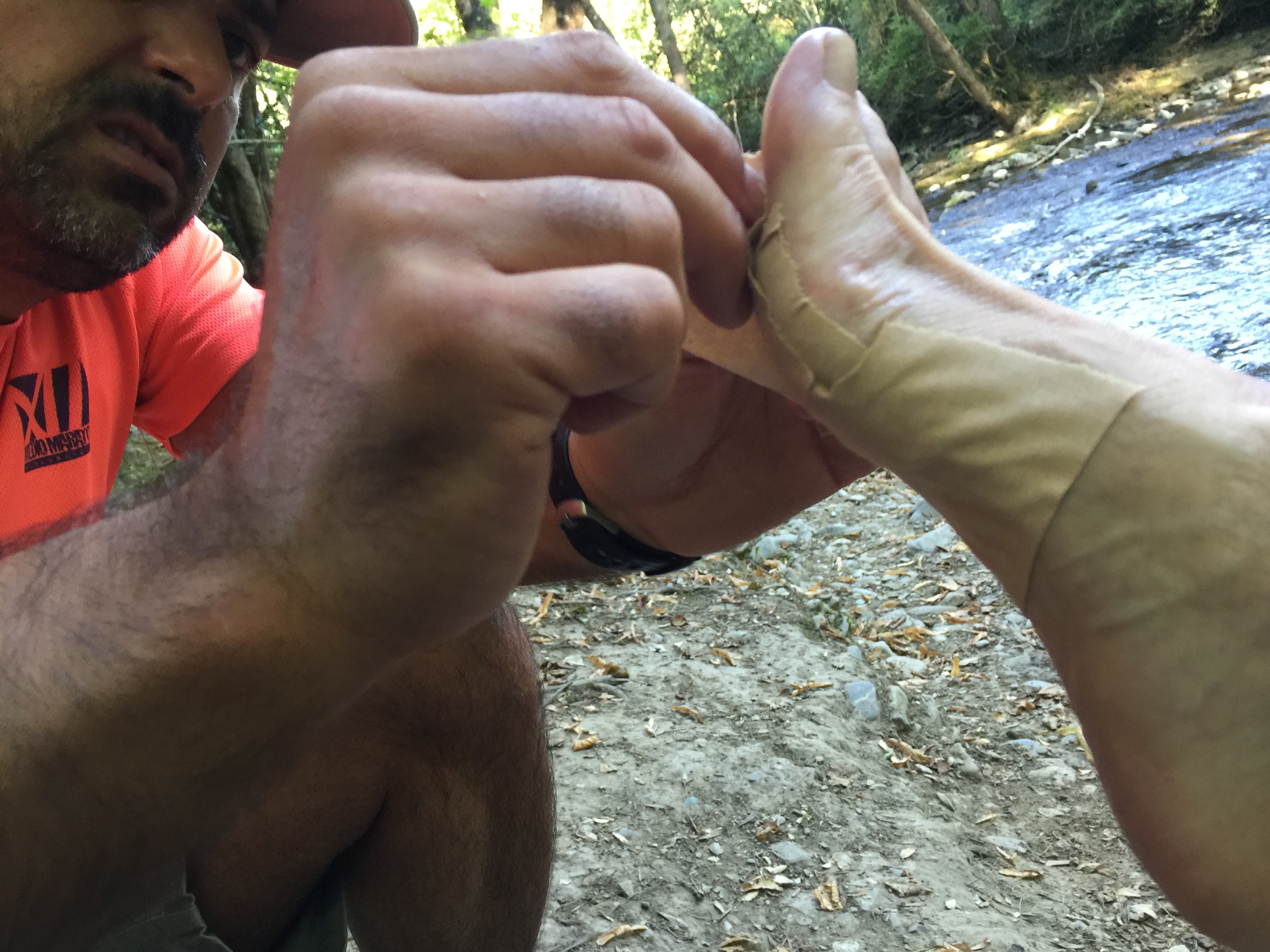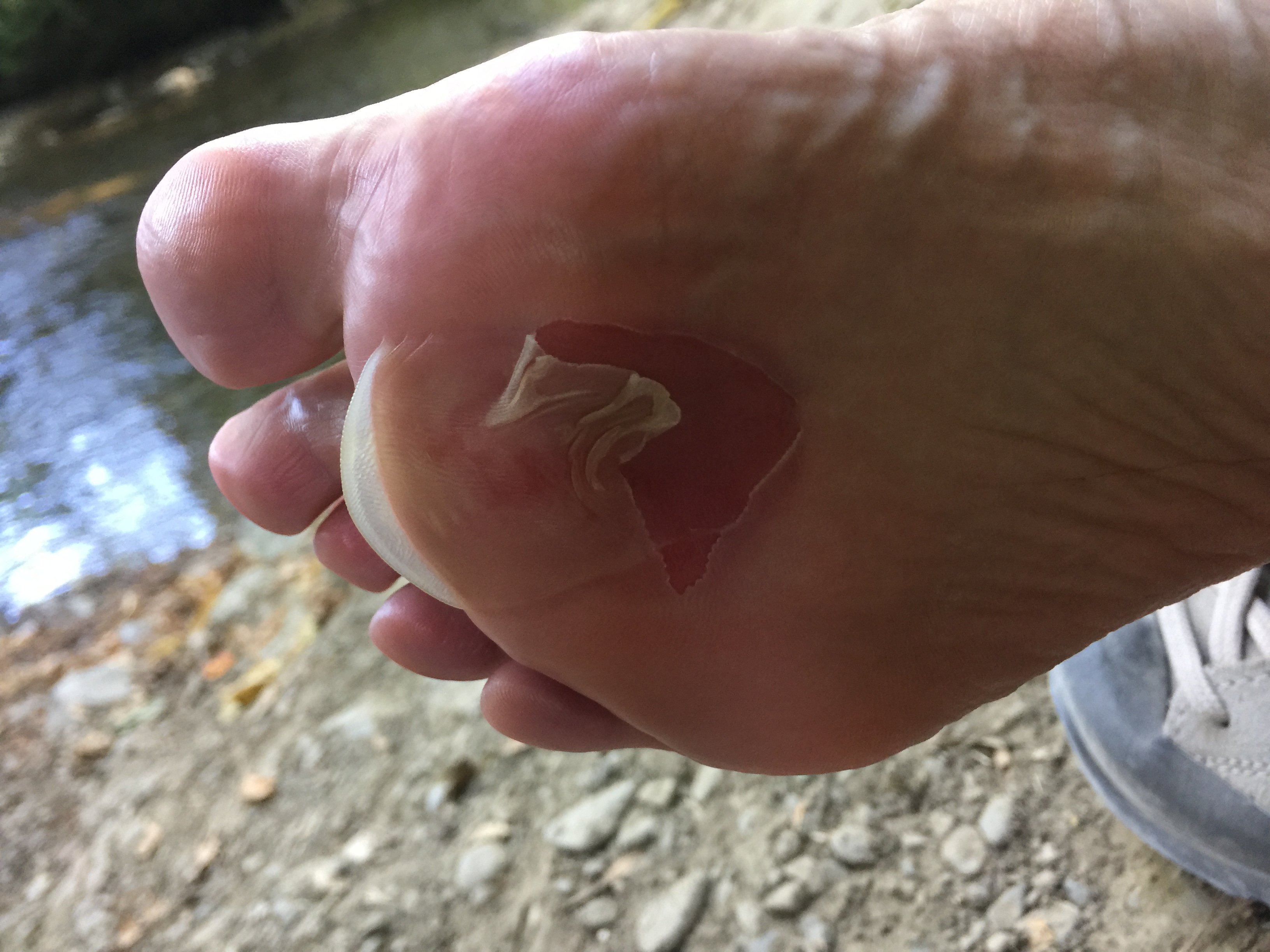 Me venia molestando el pie por tanta caminat estos días. Cuando termine el dia 1 vi que una ampolla se estaba cocinando y ayer en mi segundo día ya estaba ahi pero sin reventar. Hoy en el km 9 me tope con un rio y decidi pararme y descansar mis patitas y la espalda. No habia nadie, solo yo, y llego un chico tmb a hacer un stop y ahi platicando le dije que me dolia mucho el pie al caminar. Yo no traje material de curacion para estos casos como gasas, alguna medicina para las ampollas etc. Total que el chico me dice que el trae todo eso y que si quiero que me ponga. Pues le acepte el ofrecimiento. Me quite las dos calcetas, el zapato y me tope ahora si con la ampolla ya reventada. Pues el chico un encanto, se llama Pascual, solo de ver mi pie como que le dio cosa y me ayudo a alivianarme.