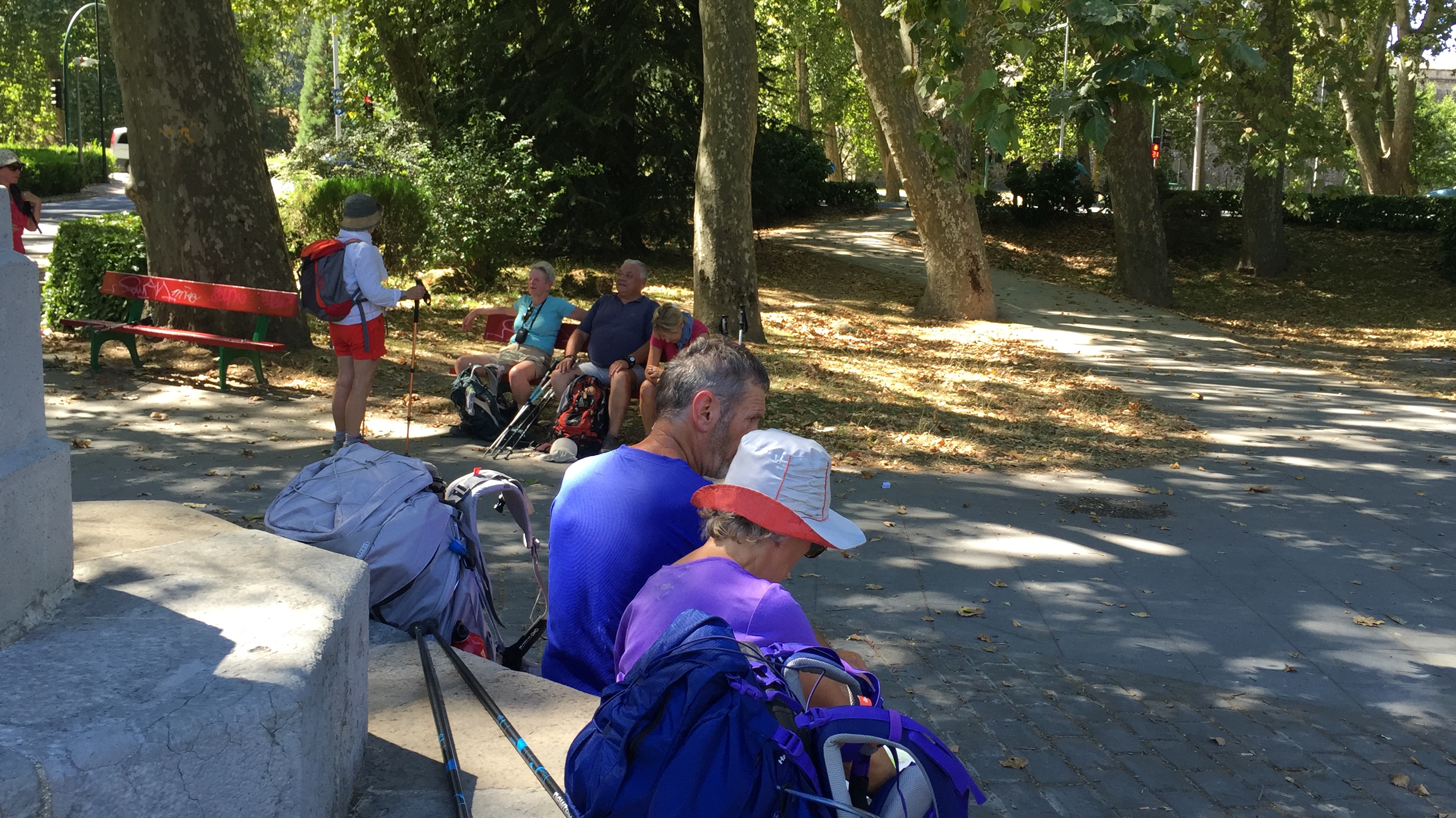 No paro de sorprenderme de estos europeos que con 60 y tantos años hacen el camino cargando una back pack asi como la mia, llevan un paso increible. Al llegar a Pamplona cruzas un puente y llegas a un parque con sombra y unas bancas, pues ahi llegue a aterrizar xq ya andaba molidiisma. Y ahi me sente a descansar y ver la gente que iba llegando. Vi a mucha gente de la 3era edad…me dejan asi ?